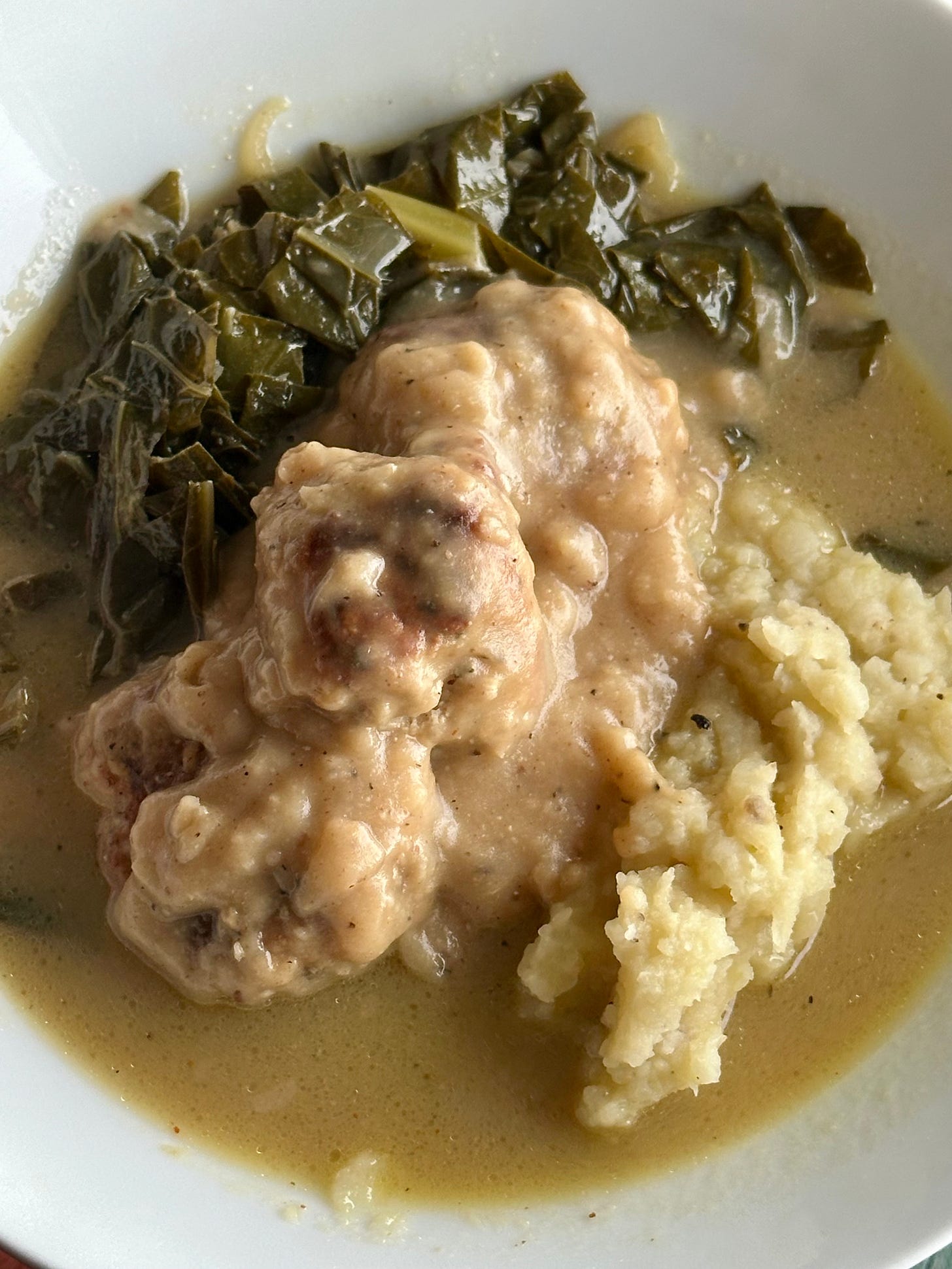 All this talk about Sunday dinners has me thinking about one of my favorite comfort meals: turkey meatballs, collard greens, mashed potatoes, and onion gravy.